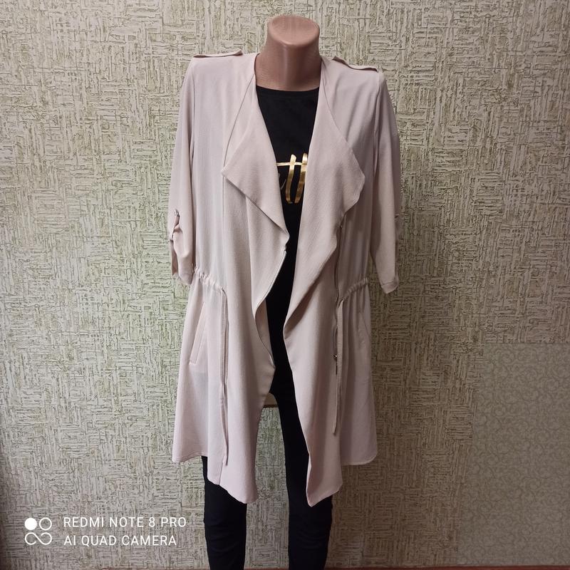 Лёгкий летний кардиган от Atmosphere. Состояние очень хорошее, кардиган застёгивается на молнию и утягивается на поясе шнурком.Рукав 3/4,есть два боковых кармана. Размер EUR 36/S. Длина 83 см, ширина по пройме 47 см, длина рукава от плеча 38 см.