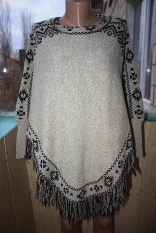 Стильна тепла кофта пончо з бахромою Розмір єдиний Стан дуже хороший Заміри: довжина попереду 73+бахрома, груди вільна. В наявності великий вибір сережок-пензликів, стильної біжутерії, недорогий цікавою одягу та окулярів! Заходьте в гості)