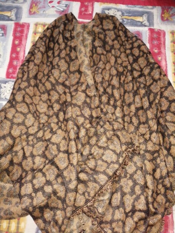 Тепленькое пончо в леопардовом окрасе. Новое, привезенное из Германии. Бирка находится. Бахрома как снизу, так и по бокам. Состав: 53% вискоза, 47% полиакрил. Замеры: полдлина плечевая часть 131 см, длина вниз от плеча 79 см, полдлина низа 130 см.