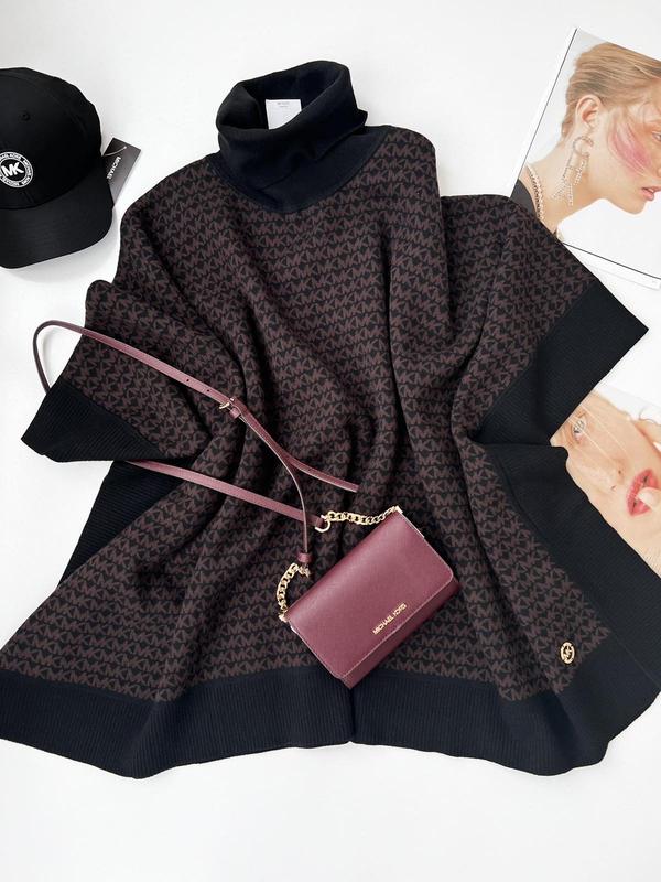 Пончо жіноче Michael Kors Пальто женское Майкл Корс Оригінал Розмір : L/XL Колір : коричневий / чорний ( монограма ) Крій вільний Склад тканини : 52% вовна , 48% поліестер. Заміри : Пог 121, Довжина 75 см