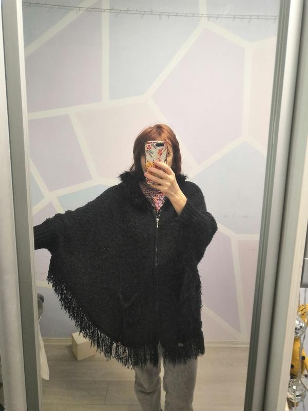 Уютное шерстяное пончо на молнии с капюшоном, украшенное нат.мехом. Пряжа букле. На манжете, молния двойная металлическая. По плотности как свитер. На фото на рост 164см.