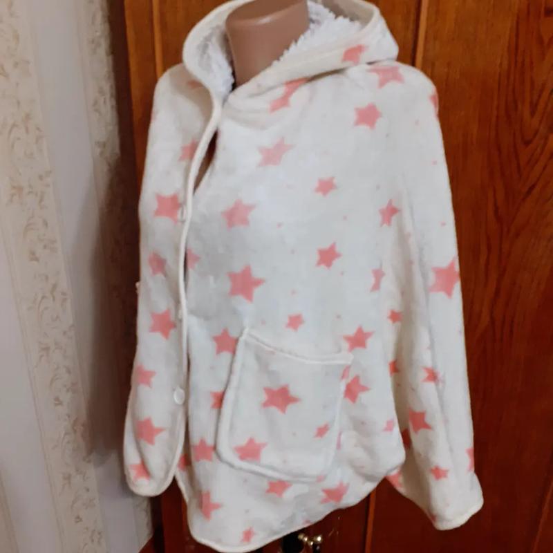 Пончо накидка велюровый с большим теплым ворсом как овчина с карманами на пуговках рукава на кнопках с капишеном ванильного цвета с принтом звездочек!состояния новой вещи👍Ш по низу 120 Дл.64 По ог 110см!