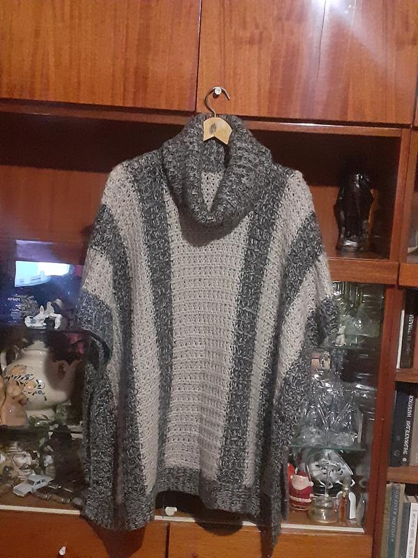 Елегантне легке пончо, яке чудово виглядатиме в поєднанні як із брюками, джинсами, так і із спідницею. Довжина-70см, ширина-95см. Без бірки. Більш за все-акріловивий мохер. Добре тягнеться. Підійде на любий розмір.