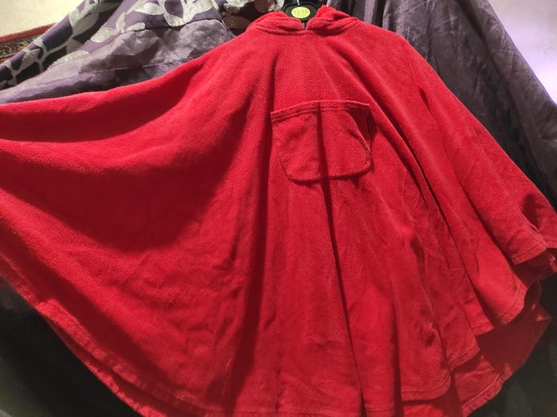 Очень удобный, оверсайз. Указан размер L, подойдет даже на большее. Длина спереди 74 см, спинка 79 см, рукав от ворота 61 см, окружность ворота 59-60 см. Капюшон отслеживается, он на кнопках.