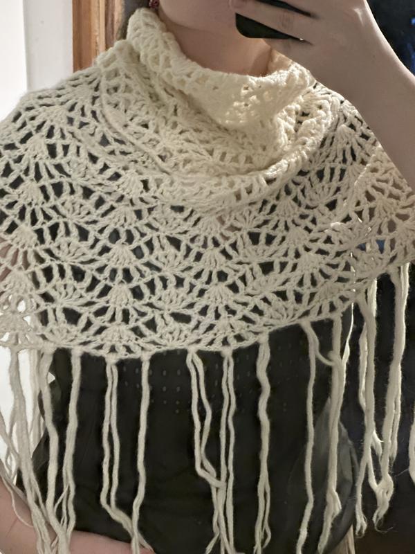 Пончо ажурное с бахромой вязаное. Горловина висока. Состояние хорошее, дефектов не имеет.