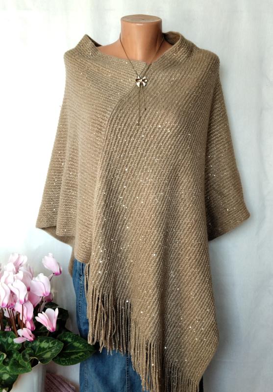 Шикарное пончо, очень мягкое, украшенное пайетками. Можно надевать по разному по желанию. Замеры: ширина сверху 32-37 ширина по низу 120- 140, бахрома 12 см длина 54/76 + бахрома
