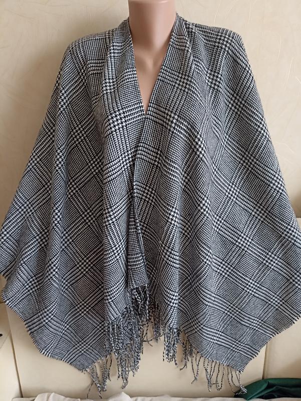 Тоненькое женское пончо, но теплое. бирка отсутствует но на ощупь акрил. Высота 70, ширина каждой половинки 67 см