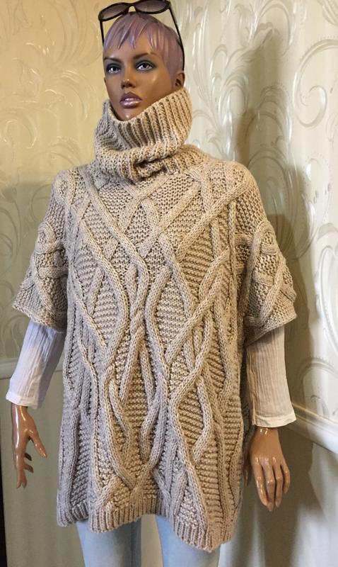 Тепле об'ємне пончо великої в'язки бежевого кольору, вільного крою, високим об'ємним коміром (гумка), розрізи з боків. Бренд ZARA. Бирка зі складом вироби зрізана. За складом імовірно: вовна, акрил. Розмір на бірці на виробі M, завдяки крою можна розглядати як OVERSIZE. Стан ідеальний. Заміри: довжина від плеча горловини - 37 див., ПОГ - 80 див, довжина виробу від плеча - 66 див. Розмір манекена S. Ласкаво просимо в мій магазин. Відомі бренди, відмінна якість - доступні ціни.