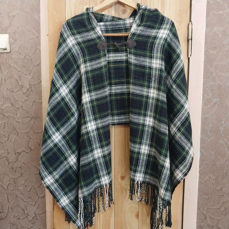 классный пончо с капюшоном в клетку, очень легкий, почти ничего не весит, но при этом очень теплый