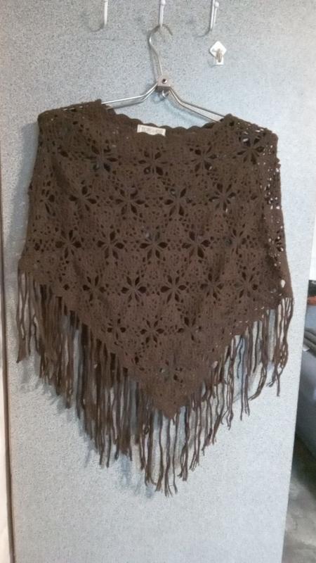 Пончо. Цвет насыщенный шоколадный. Полушерсть. Приятное и теплое. Состояние практически новый. Довжина по центру, без бахроми 61 см. На плечах 38 см.