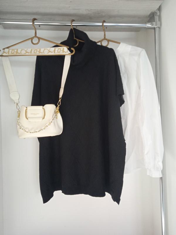Стильна однотонна кофтинка з коротким рукавом чорного кольору. Тепла та зручна. Приємна на дотик. Фактурна машинна в'язка. Товстенька нитка. Стрейч. Фасон-пончо. По боках зафіксована гудзичками. Лягає вільно -оверсайз. Акуратний хомутик. Доречно виглядає поверх блузи чи гольфа. Розмір універсальний. Пог-77см. Довжина-75см Мірки без натяжки по самому виробі.