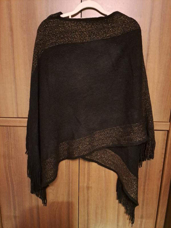 Асимметричная женская накидка, пончо. Основной цвет- черный, верхняя и нижняя часть украшена люрексовой нитью, добавленной к основной ( фото 2,3).