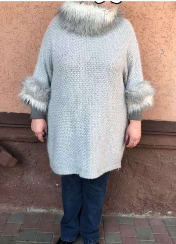 Теплое пончо с искусственным мехом. Нити немного "травка". Ширина 144, длина 80, от горловины длина рукава 50. Размер указан 50, но можно и больший, на фото 54р.