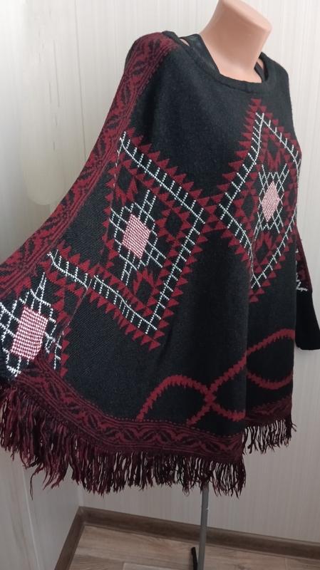 Женское пончо в этническом стиле с бахромой и геометрическим орнаментом. длина изделия оттгорловины с кисточками 77 см
