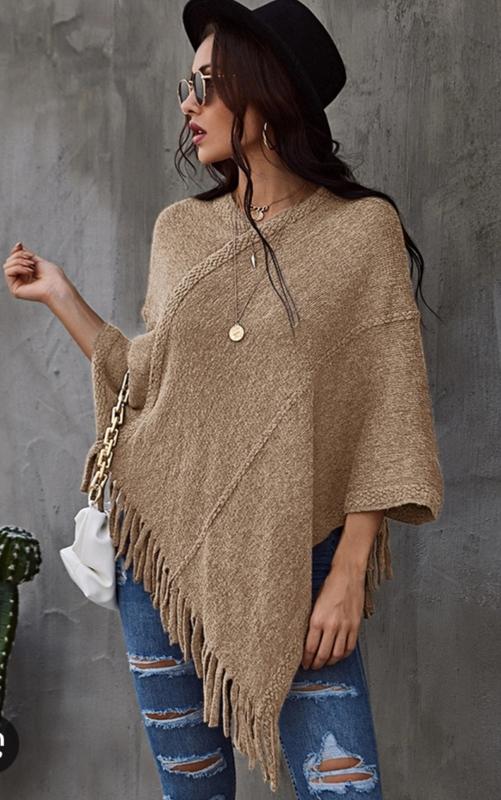 Шикарное пончо, очень мягкое, украшенное пайетками. Можно надевать по разному по желанию. Замеры: ширина сверху 32-37 ширина по низу 120- 140, бахрома 12 см длина 54/76 + бахрома