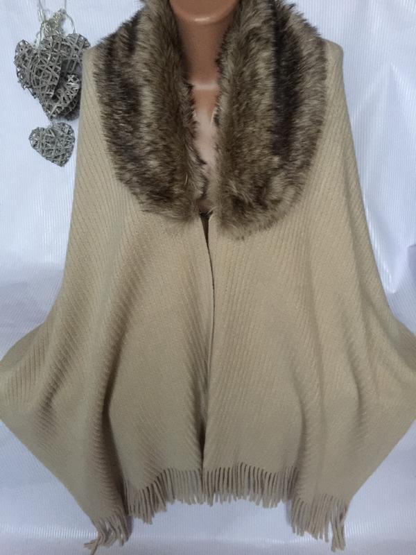 Подойдёт на любой размер , мягкий нежный приятный на ощуп , мех съемный , длина 71, с бахромой 84, ширина 105 рукав 63