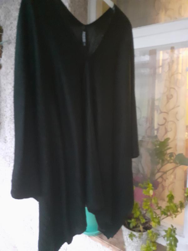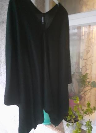 Удобная вещь в ненастную погоду, как запасной вариант для утепления в холодном офисе. Чёрное трикотажное пончо, не очень толстое . Размеры : длина 70 см, рабочая ширина 84 см, высота выреза горловины переда 23 см, спинки 14 см. Обалденно смотрится на светлой блузке или гольфе.