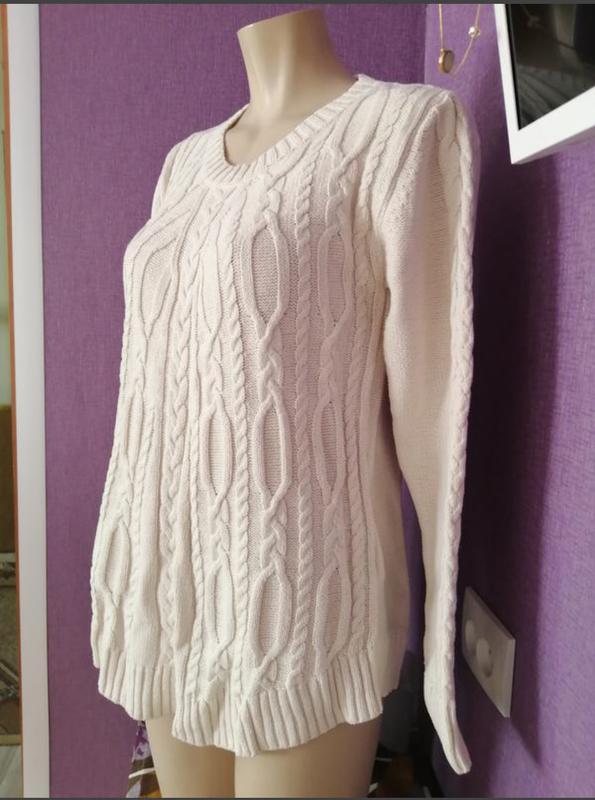 Вязаная мягенькая молочного цвета кофточка, указан размер м но можно и на эльку. замеры: длина 73 см, рукав от плеча 65 см, от горловины 77 см, пог 44-50 см, в районе бедер 50 -56 см, очень красивая вязка, состояние отличное.