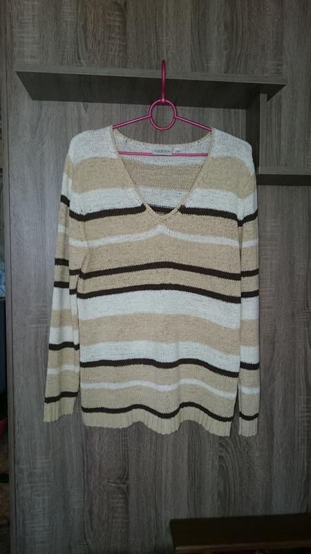 Пуловер свитер джемпер Canda (бренд C&A) женский. Размер 48 - 50. Приятная расцветка в бело - бежево - коричневую полоску. Силуэт прямой, свободный, с У- образным вырезом горловины. Материал - мягкая пряжа, состав: 65% акрил, 35% нейлон. Длина 70см, окружность груди 110см, длина рукава 67см. Состояние очень хорошее.