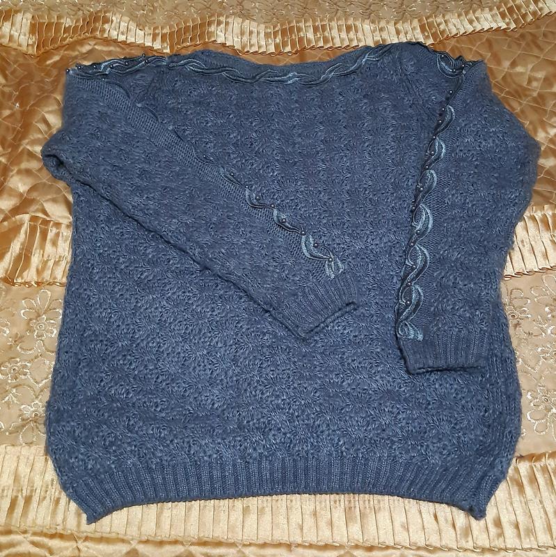 Гарний полувер у гарному стані, цікавої в'язки.тепленький, не колить.Є недолік -катишки на рукавах.Не критично.В ціні враховано .Светр гарного джинсового кольору, прикрашений стрічками з наместинами.Виробник-Туреччина💐