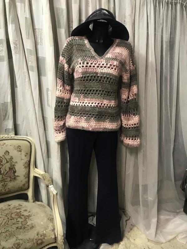 Вязка крючком. Нить шерстяная толстая. Широкий рукав , удачное сочетание цветов. Отличная работа мастера. Замеры: длина-60 см, ПОГ-44 см, ПОБ-46 см, рукав от ворота-70 см.