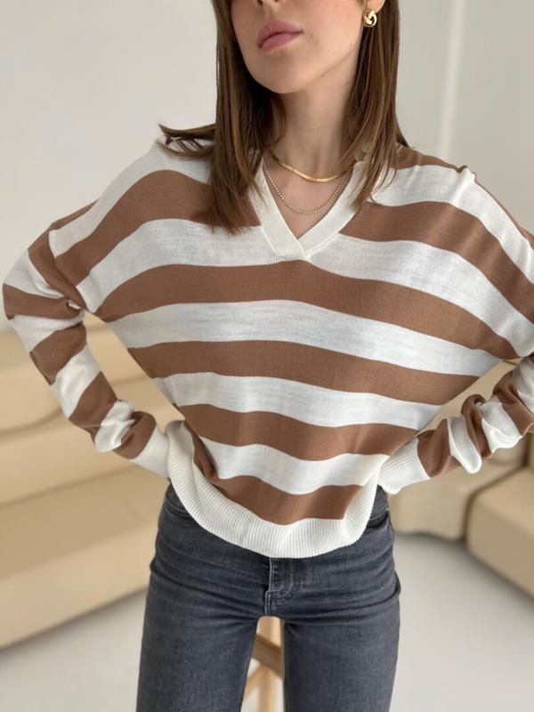Пуловер білий в полоску бежевого кольору з розрізами з двох сторін . Бренд Primark , розмір S. Вільного крою іде як Oversize . Дуже стильно виглядає. Стан нового