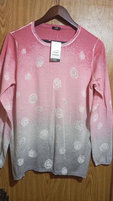 очень классный пуловер из 100%которая,супер тонкий,очень лёгкий,красивое сочетание серо розовых тонов,качество отличное,размер 40,по замерам ширина плеча 38 пог 53 длина рукава 61 длина 67 на фото к сожалению невозможно передать качество и красоту изделия,сидит и смотрится отлично,оплата на карту приват или наложенный платёж по предоплате на доставку