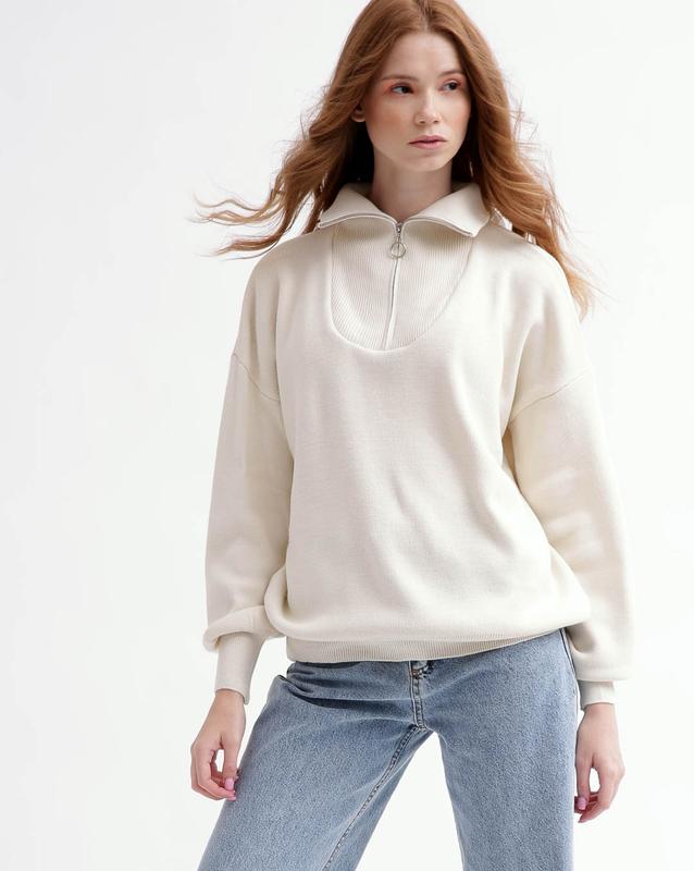 Женский однотонный пуловер свободного силуэта. Модель имеет спущенную линию плеча, манжеты на рукавах и по низу. Стойкий воротник с застежкой-молнией.