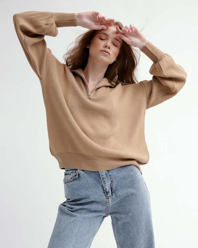 Женский однотонный пуловер свободного силуэта. Модель имеет спущенную линию плеча, манжеты на рукавах и по низу. Стойкий воротник с застежкой-молнией.