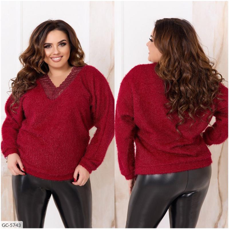 соПуловер GC-5743 Код 3536 Розмiри: 48-50, 52-54, 56-58, 60-62, 64-66 Ткань: мохер (мягкое вязаное полотно). Цвета: серый, голубой, бордо, розовый. Длина пуловера: 68, 69, 70, 71, 72 см. Длина рукава: 71, 72, 72, 73, 73 см. Обхват рукава: 42, 45, 48, 51, 54 см. Замеры готового изделия: 48-50 ог 110 от 110 52-54 ог 118 от 118 56-58 ог 126 от 126 60-62 ог 134 от 134 64-66 ог 142 от 142 Стильный пуловер из мягкого вязаного полотна, силуэт свободный, рукав цельнокроеный "летучая мышь". Вырез горловины v-образный, спереди декорирован красивым кружевом. Низ рукава на манжете. Карман, застежек нет.