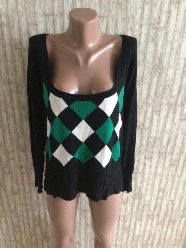 Цікавий пуловер з глибоким декольте. Можно під гольф або тонку блузу. Довжина 63, пог 55, по низу 52, рукав від горловини72, глибина декольте 19.