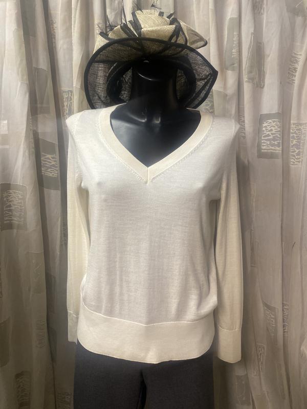 Стильный пуловер из тонкой шерсти от COS. Цвет айвори (слоновой кости). Склад:вовна-100/. Шерсть такого качества, которая не создает «катки». Размер по набору-XS. Замеры: длина-59 см, ПОГ-46 см, ПОБ-43 см, рукав -62 см. Есть нюанс-дирочка на одном рукаве (см. Последнее фото).