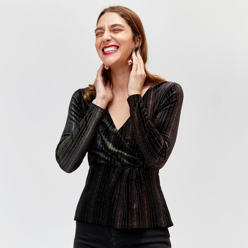 Стильна блискуча кофта британського бренду Warehouse з вирізом Вказано розмір 6 (гарно йде на S/М (42-44) Плечі ширина +/- 35-36 см Довжина 54 см Довжина рукав 61 см Ширина на талії (резинка) 36 см Виріз відкритий, не пришитий (деталі на фото) Склад на останньому фото.