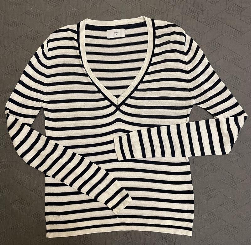 Полосатый свитер с V подобной горловиной. Бренд Minimum. Размер S. Состав: натуральный. Замеры: Длина - 64 см. Ширина - 45 см. Длина рукава - 72 см. Есть небольшой дефект, который можно легко исправить, показан на фото. Условия отправки и покупки: 🗣 Из личного гардероба 🚖Отправка всеми логистичными компаниями 💳Оплата на карту 💯Безпечна оплата Shafa