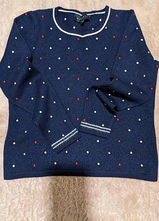 Пуловер, вовна 100%. Розмір вказано М, але не відповідає дійсності, підійде на XS, але орієнтуйтесь на заміри. Рукав - 49 Плече - 6 ПОГ - 43 Довжина - 45 Ширина від плеча до плеча - 30 Горошки мають три кольори: червоний, білий, ніжнобежевий. Стан хороший. Дуже м'якенький до тіла, знімати не хочеться. Відправлю Новою Поштою після оплати. За безпечною оплатою не надсилаю. Повернення немає. Ставте додаткові питання - з радістю відповім.