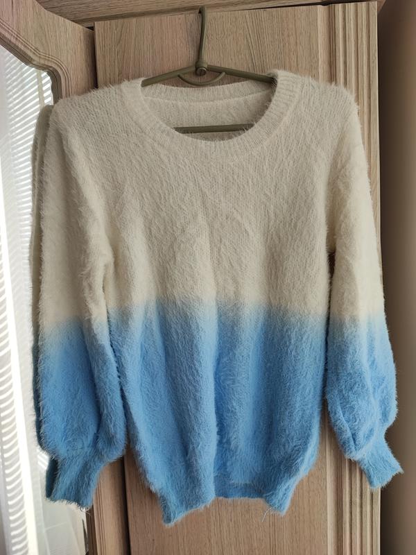 Мягкий теплый свитер. Материал травка, ангора. Цвет молочный с голубым. Размер S. Замеры: длина по спине - 56 см рукав 47 см + 8 см резинка ширина - 39 см > тянется до 53 см
