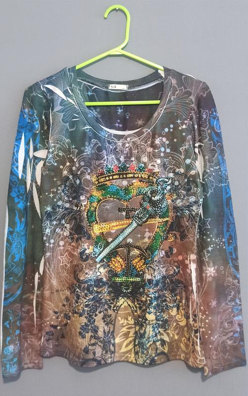 Классный лонгслив, пуловер VS мягкий трикотаж оригинальный королевский принт прикрашений стразами идеально садится, подчеркивая фигуру размер M/L