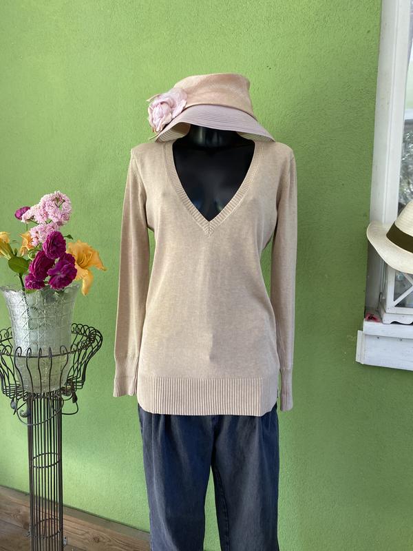 Стильный качественный пуловер бежевого цвета. Состав:коттон-100/. Размер по набору-XL. Замеры: длина-70 см, ПОГ-49 см, ПОБ-42 см, рукав-64 см.
