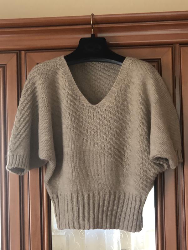 Пуловер з мохером з коротким рукавом , красивого бежевого кольору. Довжина по спині 50 Довжина плеча з рукавом 39 ПОТ 40 в спокійному стані ( тягнеться до 50) Склад: 30% мохер, 20% лана, 50% акрил Країна виробник Італія