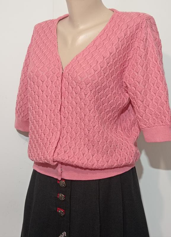 Кофта нежная, красивая вязка, от известного бренда Peter Hahn. Застёгивается на кнопки, манжеты на рукавах и внизу двойной вязки. Бирка о составе ткани срезана, предположительно - хлопок. Размер указан D 38. 🍂 плечи 43 🍂 ПОГ 52 🍂 ПОТ 50 🍂 длина 54 Состояние идеальное.