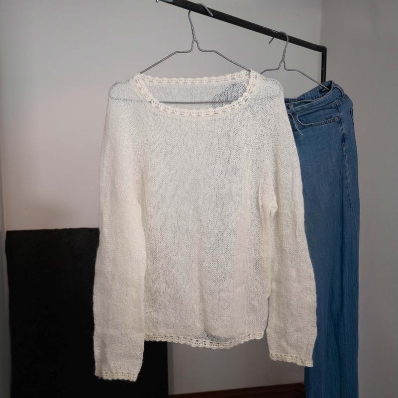 Нежная легкая белая паутинка, нежная с отделкой размер 42 -48, рукав 55, Пог 54,ворс умеренный,цвет молоко.Увязка мелкая универсальная под все.