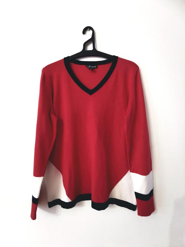 Новый пуловер в спортивном стиле. Цвет красный, белый, тёмный синий. Длина 61, пог 52, поб 51, рукав 59