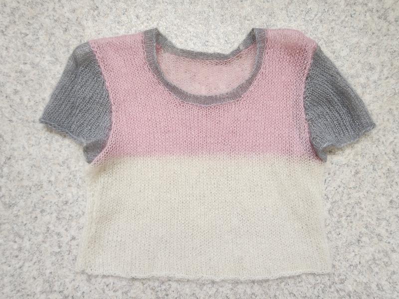 Вязаный по заказу топ паутинка из мохера 3-х цветов: молочно-белый, розовый, серый. Подходит на размеры S-M ОБ'ЄМИ: грудь 82 см талия 82 см длина плеча 9 см ширина спинки 31,5 см длина рукава 16 см длина изделия 40,5 см Мохер: Италия.
