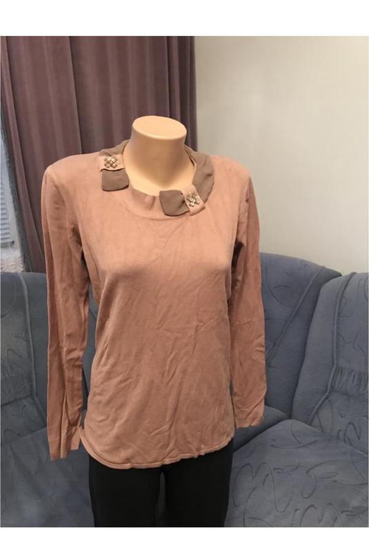 Кофта с длинным рукавом.Декольте украшено нашитым узором-камешками.По бокам бедер маленькие разрезы-6 см.Ткань очень мягкая, понятная на ощупь, равномерно тянется,плотная.Склад ткани:вискоза, лен,нейлон,эластан. Цвет-грязно розовый(последнее фото). Кофта куплена в Англии. Длина - 67 см, Рукав-64 см., ПОГ-55см., свободно тянется до 65 см.