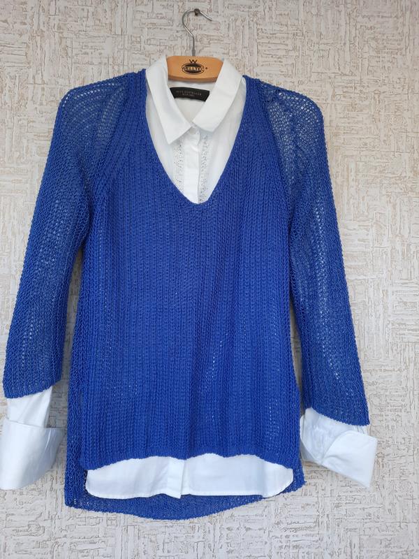Продам вязаниї пуловер. Оверсайз, синего кольору. Перед косычкою, остановка-кольчужка.Рукав 3/4.Стан добрый.Пог 46, длина рукава от горловины 58см, длина по спинке 60см