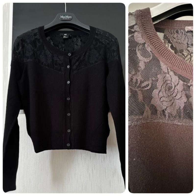 Кофточка женская (девица) с кружевной кокеткой шведского бренда ЕЙЧ ЭНД ЭМ Один раз надевается Состояние новой вещи Размер S Длина 50 см Длина рукава 58 см Груди 44 см Цвет черный насыщенный. На фото искажает цвет.