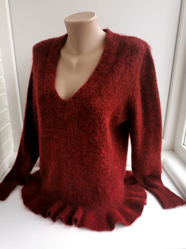 Зимняя распродажа ! Очень красивый женский пуловер из шерсти и мохера. Мягкое, пушистое полотно, не тонкое. Пуловер из меланжевой пряжи красно-коричневого цвета (темная терракота). Оригинальный фасон. По низу изделия пышная, красивая оборка. Легкий, комфортный и очень теплый. Стильный пуловер дл любой модницы для холодного времени года. Состояние отличное. Дефектов нет. Замеры по изделию : ПОГ 52 см, ширина плеча 12 см, ДР 65 см, длина по спинке 65 см. Соответствует размеру 48. Снят на манекене 46 размера. Состав : 38% шерсть, 34 % мохер, 25% ПЭ, 5% эластан (бирка) Производитель Celekcted Femme Полная предоплата на карту Отправка НП или УП