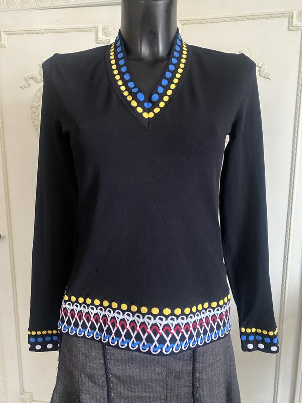 Джемпер черного цвета с ярким вызерунком от Peter Pilotto. Состав:вискоза/полиамид(63/37). Размер по набору-L. Замеры: длина-58 см, ПОГ-42 см, ПОБ-46 см, рукав-62 см