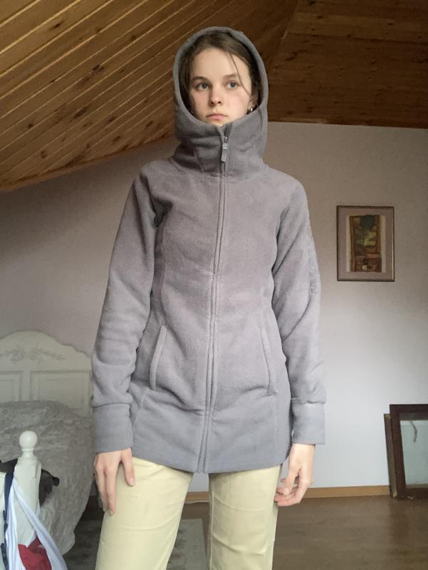 Теплая, длинная женская флисовая кофта, приталенная. С дырками для пальца внизу рукава. 100% полиэстер. Замеры: рукава - 75см, по спинке - 78см.