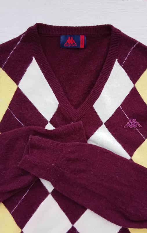 Фирменный свитер, пуловер с классическим орнаментом с ромбами (аргайл), выполненный из 100% шерсти. Расцветка: бордово-коричневый фон, желтые и белые ромбы. Параметры в см.: длина 66, ПОГ 52, по низу 40+, ширина в плечах 44, плечо 16, длина рукава от втачного шва 62, бицепс 17 см в полуобхвате. Небольшой нюанс: при стирке по краям чуть порозовели белые участки, механических повреждений НЕТ. В цене учтено.